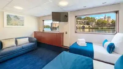 On the upper deck, guests can savor refined cuisine in the panoramic restaurant, where large windows frame stunning river views. The same deck also hosts the lounge and bar, complete with a dance floor for lively evenings. For moments of pure relaxation, the sun deck offers comfortable loungers and shaded areas, an inviting retreat to admire the passing scenery.