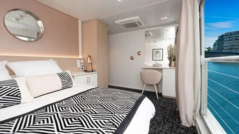 The ship accommodates guests across two decks. On the upper deck, cabins feature large bay windows with French balconies for uninterrupted views of the Seine. On the main deck, cabins are bright and airy with expansive windows that open onto the passing landscapes.