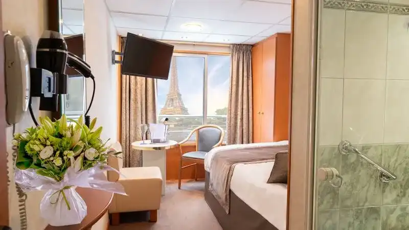 On the upper deck, guests can enjoy refined French cuisine in the panoramic restaurant, where every meal is served with a view. The adjacent lounge bar with a dance floor is a vibrant space for cocktails, entertainment, and evening gatherings. For moments of relaxation, the sun deck offers comfortable loungers and a shaded area, perfect for soaking in the breathtaking river views and peaceful surroundings.