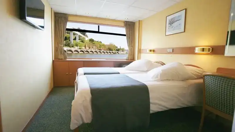 Fully renovated in 2015, this intimate 75 m ship accommodates 138 passengers in 71 cabins across three decks (11–14 m² each). Most upper-deck cabins feature large panoramic windows; others have wide windows for scenic views.