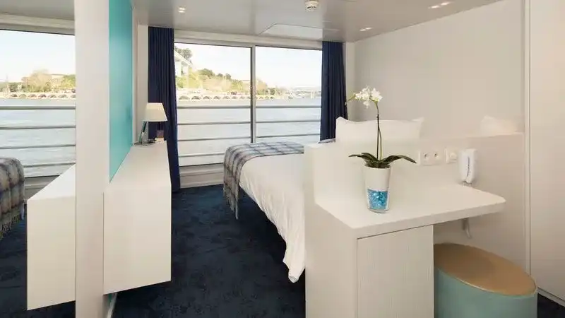 Cabins on the upper and middle decks include French balconies, while main deck cabins feature large picture windows. The ship also offers four suites, two with private sun loungers for extra comfort.