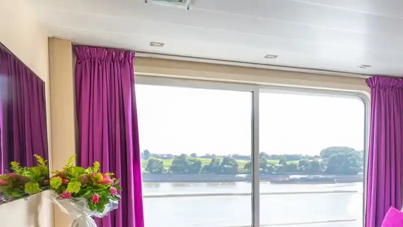 This Premium ship measures 110m by 11.4m and accommodates 174 passengers in 87 comfortable cabins (13.5m² each). Designed in warm chocolate tones with lilac accents, the décor, by Maria Rosa Rosello, pays tribute to Gérard Schmitter’s love of delicate, floral art.
