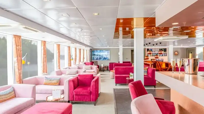 Spacious public areas feature large panoramic windows, and upper deck cabins come with private terraces and outdoor furniture. All meals are served in the main deck restaurant, while the upper deck lounge/bar offers music, dancing, and a cozy patio with beautiful views.