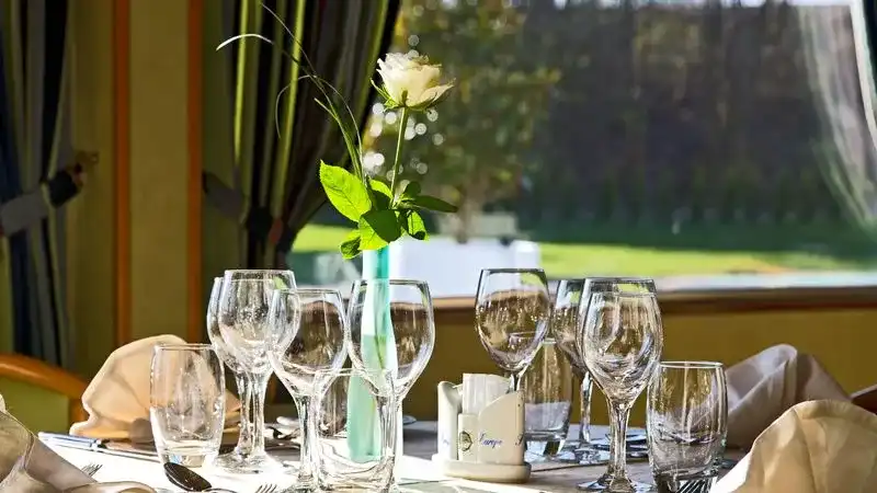 The upper deck restaurant serves every meal in a refined setting with panoramic windows showcasing the river views. Guests can relax in the lounge bar with dance floor or unwind on the sun deck, equipped with comfortable loungers and a shaded area to enjoy the scenery.