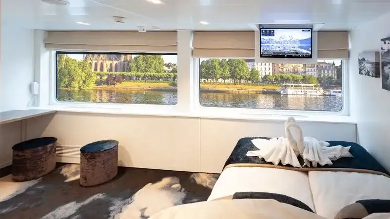 Completely refitted in 2019, this intimate standard ship measures 82 meters in length and 9.5 meters in width, accommodating up to 90 guests in 45 comfortable cabins across two decks. Each cabin is thoughtfully designed to provide modern amenities and ensure a relaxing stay. The interior décor reflects the spirit of romanticism, with mineral and bluish tones inspired by the Channel Islands, where Victor Hugo spent his exile, and subtle brass and Art Deco accents that capture the elegance of the era.