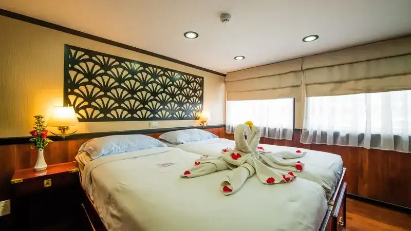 The RV Lan Diep is a 22-cabin river ship that gracefully cruises along the Mekong. Inspired by traditional riverboat design, its exotic wooden hull blends beautifully with the region’s lush scenery. Intimate and elegant, the ship combines warm décor with modern comfort, offering inviting spaces and top-quality amenities for a truly memorable cruise experience.